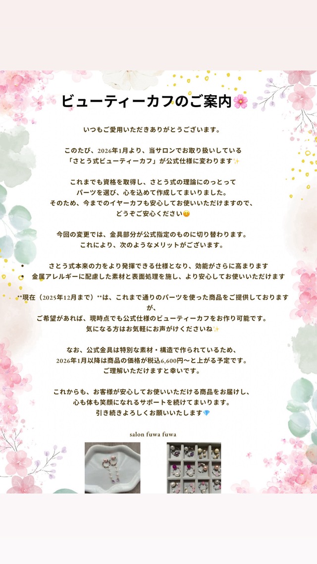 さとう式公式ビューティーカフの素材: 真鍮およびステンレス 表面処理:ニッケルレスメッキニッケルレス (光沢なし)金メッキ その他:金属アレルギーに配慮した素材と表面処理をしております ビューティーカフのご案内 いつもご愛用いただきありがとうございます。 このたび、2026年1月より、当サロンでお取り扱いしている「さとう式ビューティーカフ」が公式仕様に変わります これまでも資格を取得し、さとう式の理論にのっとってパーツを選び、心を込めて作成してまいりました。 そのため、今までのイヤーカフも安心してお使いいただけますので、どうぞご安心ください 今回の変更では、金具部分が公式指定のものに切り替わります。 これにより、次のようなメリットがございます。 さとう式本来の力をより発揮できる仕様となり、効能がさらに高まります 金属アレルギーに配慮した素材と表面処理を施し、より安心してお使いいただけます **現在(2025年12月まで)**は、これまで通りのパーツを使った商品をご提供しておりますが、 ご希望があれば、現時点でも公式仕様のビューティーカフをお作り可能です。 気になる方はお気軽にお声がけくださいね。 なお、公式金具は特別な素材・構造で作られているため、 2026年1月以降は商品の価格が税込6,600円~と上がる予定です。 ご理解いただけますと幸いです。 これからも、お客様が安心してお使いいただける商品をお届けし、心も体も笑顔になれるサポートを続けてまいります。 引き続きよろしくお願いいたします
